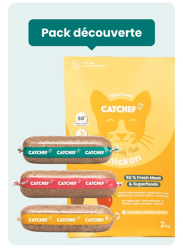 Acheter le pack découverteAdaptez la nourriture de votre chat à ses et vos envies : optez pour une alimentation exclusive Cat Chef, combinez nos repas avec ses croquettes habituelles, ou offrez-lui nos plats en guise de délices occasionnels